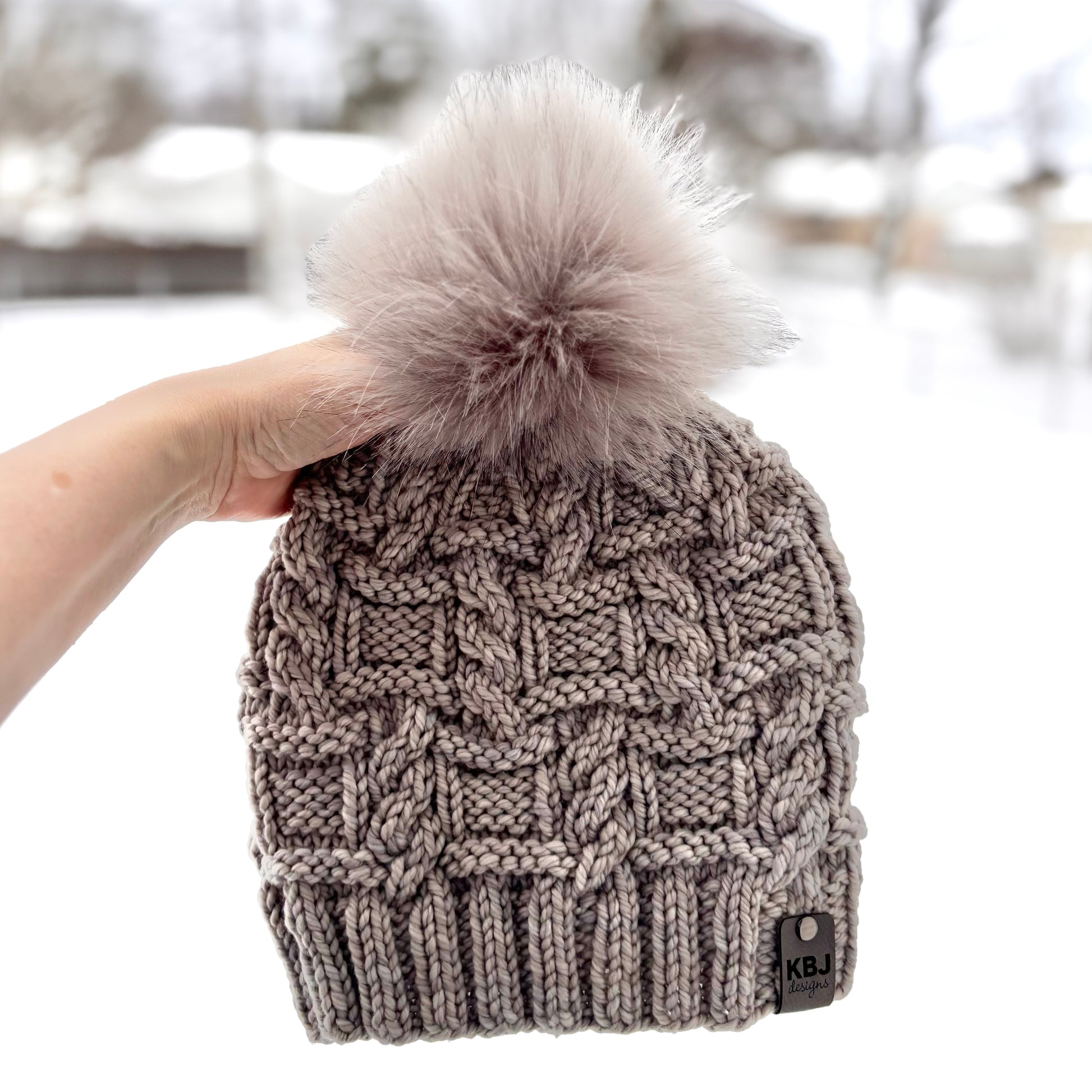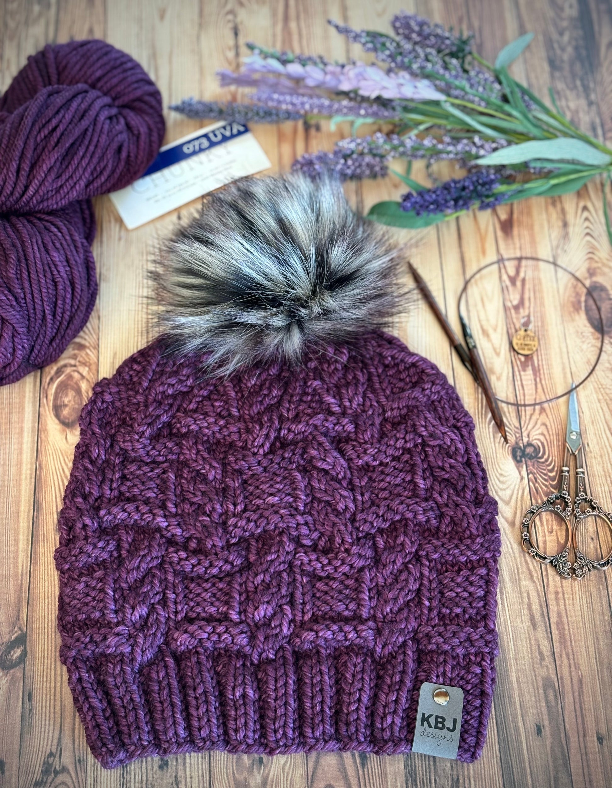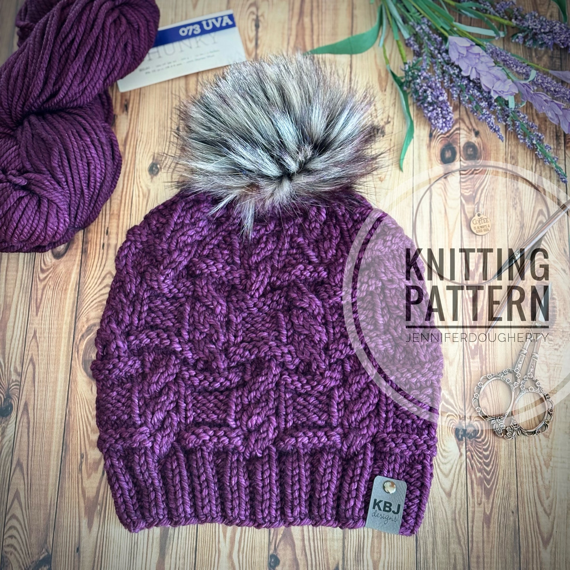 This is a PDF knit pattern for a basket weave beanie with cables worked from the bottom up and includes instructions for 2 yarn weights (light bulky and regular bulky (chunky).