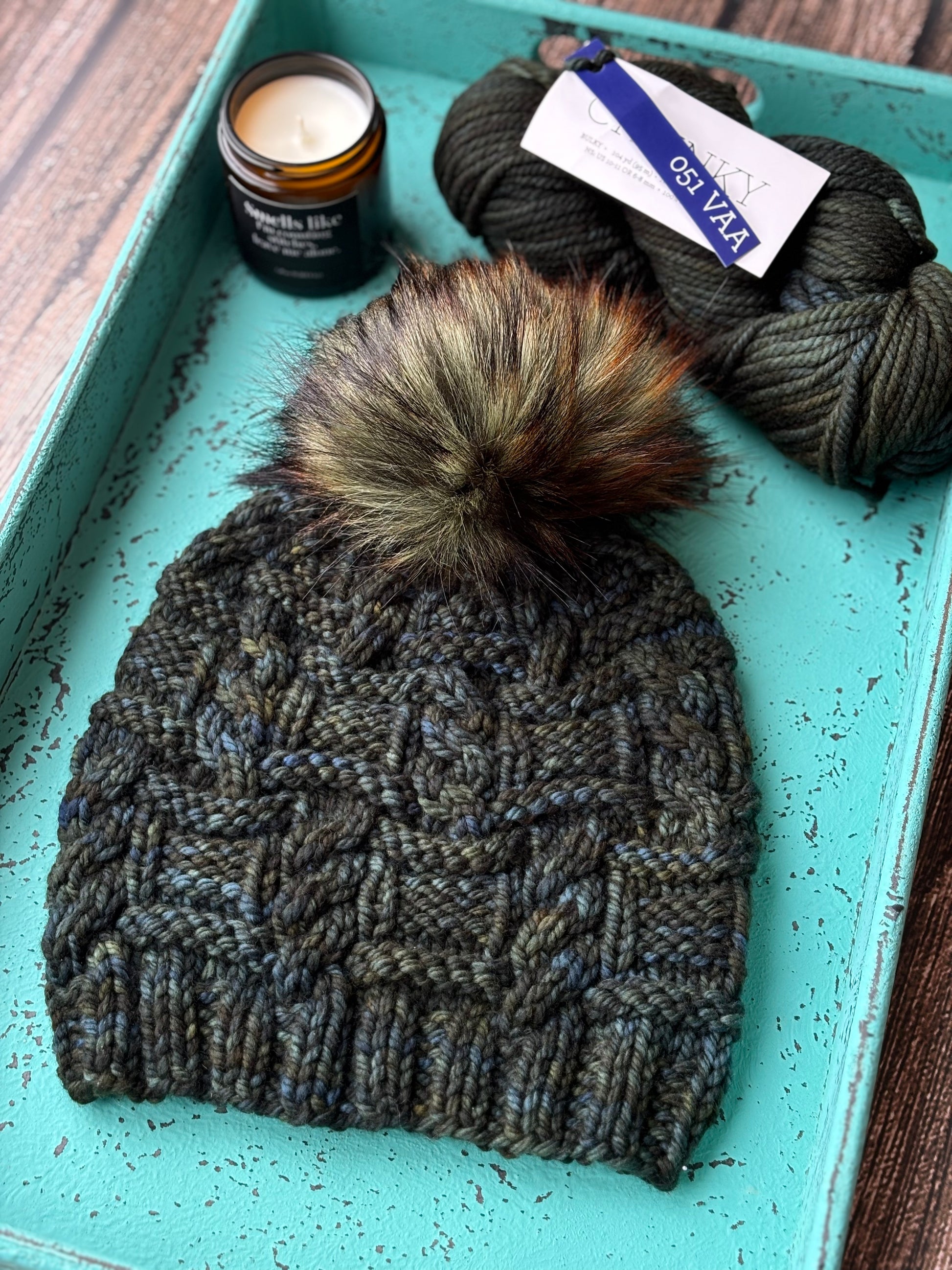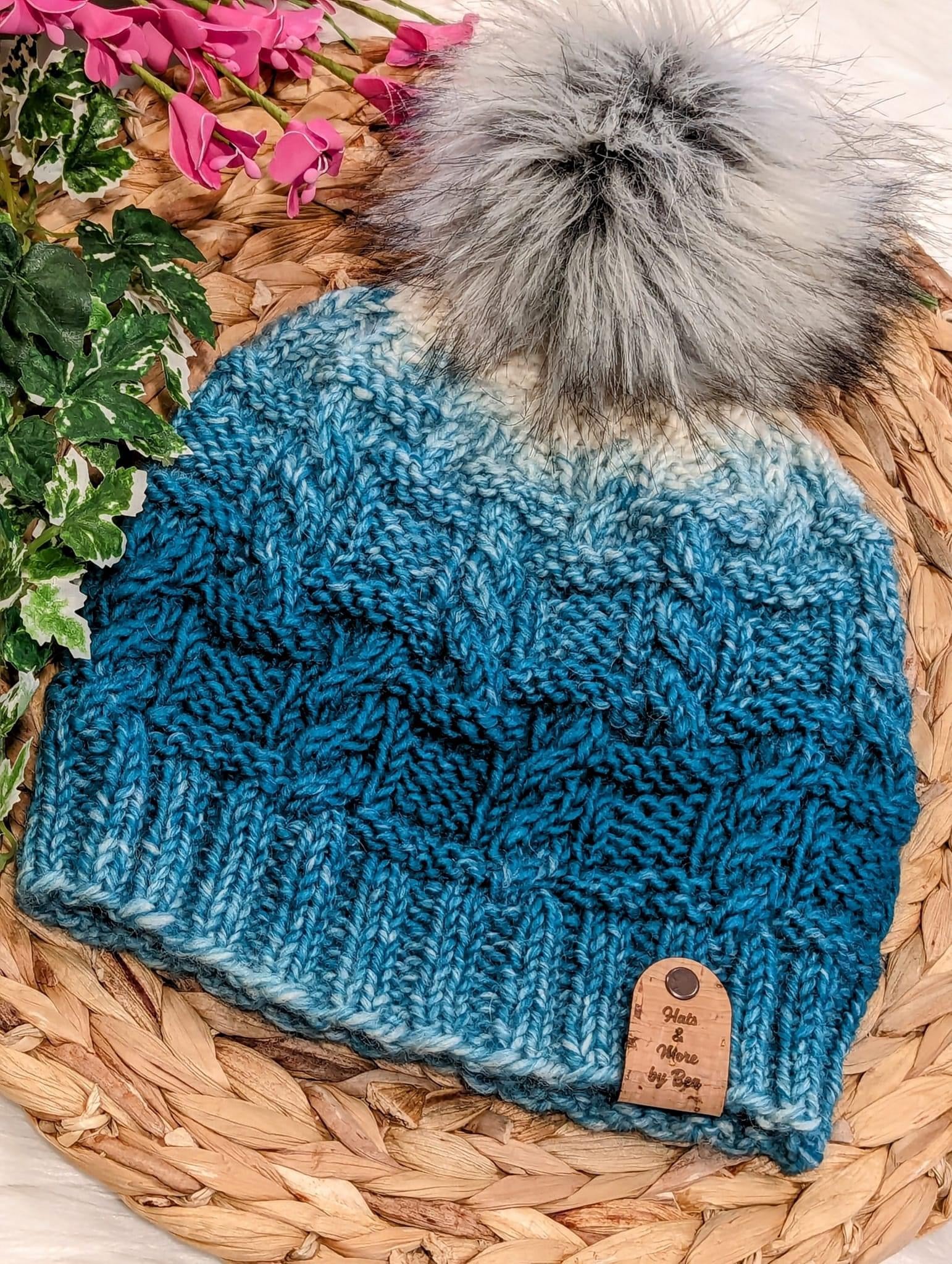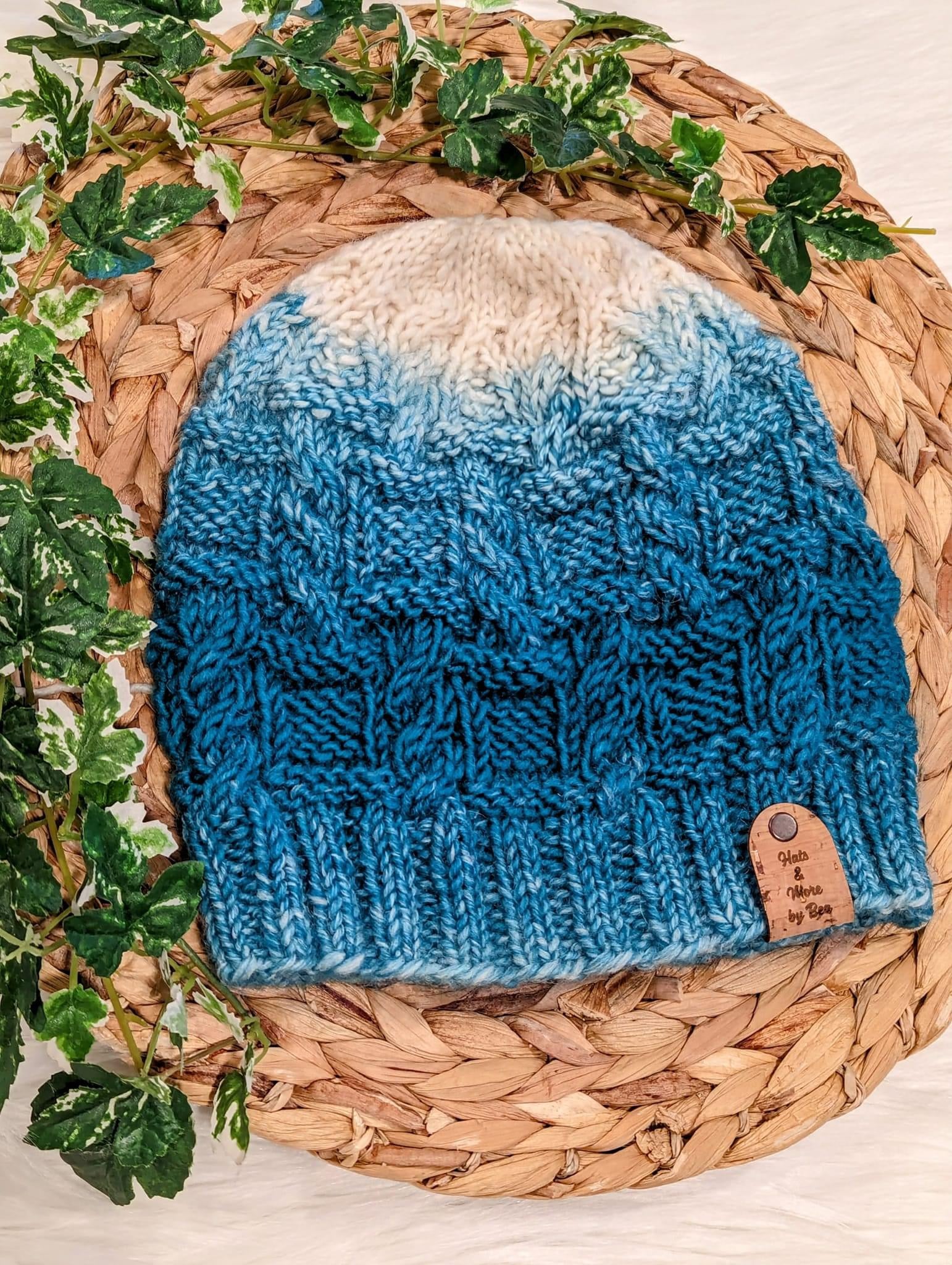 This is a PDF knit pattern for a basket weave beanie with cables worked from the bottom up and includes instructions for 2 yarn weights (light bulky and regular bulky (chunky).