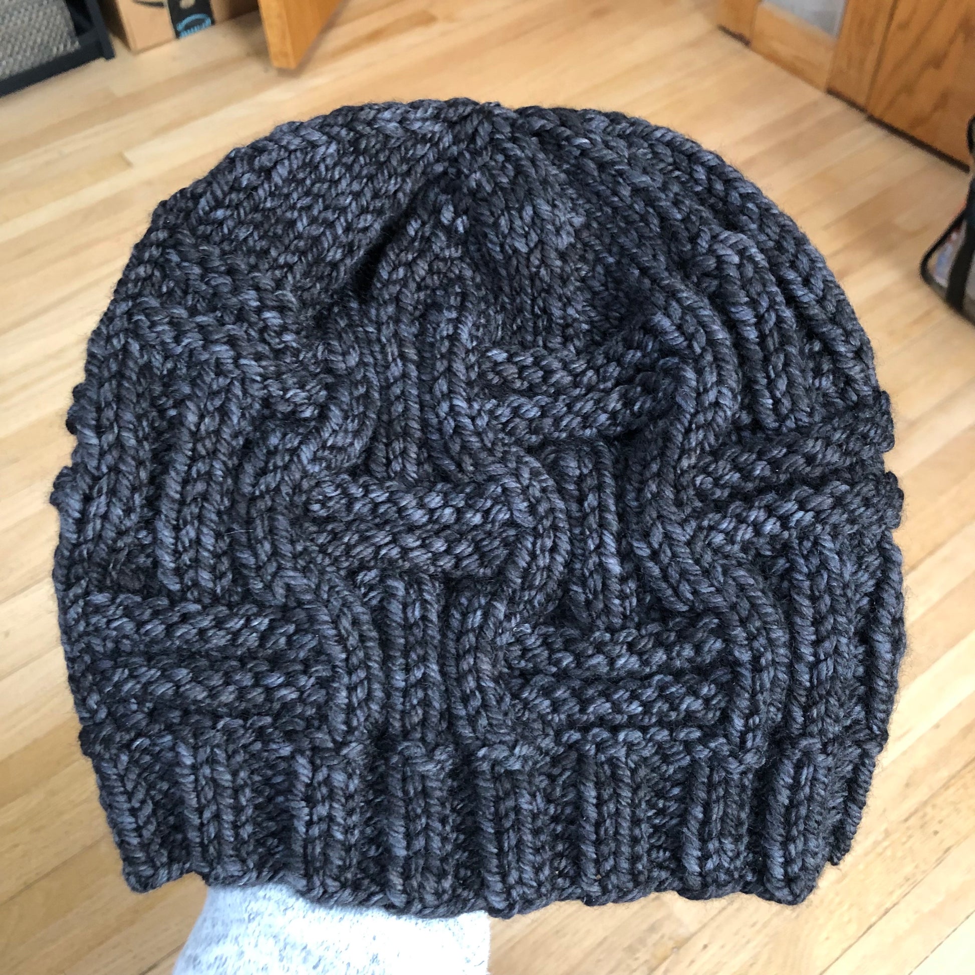 This is a PDF knit pattern for a traditional double basket weave beanie worked from the bottom up and includes instructions for 2 yarn weights (worsted and chunky).