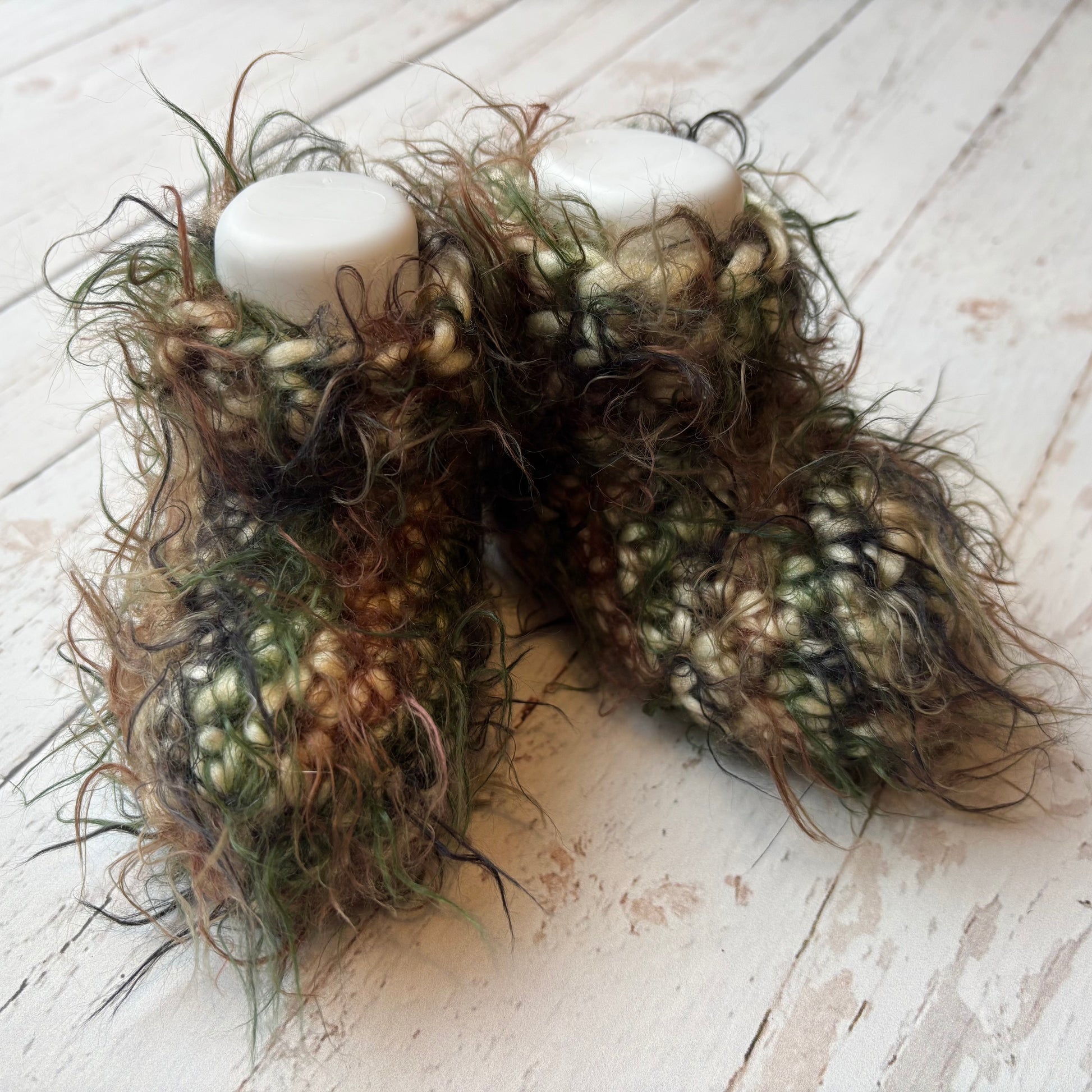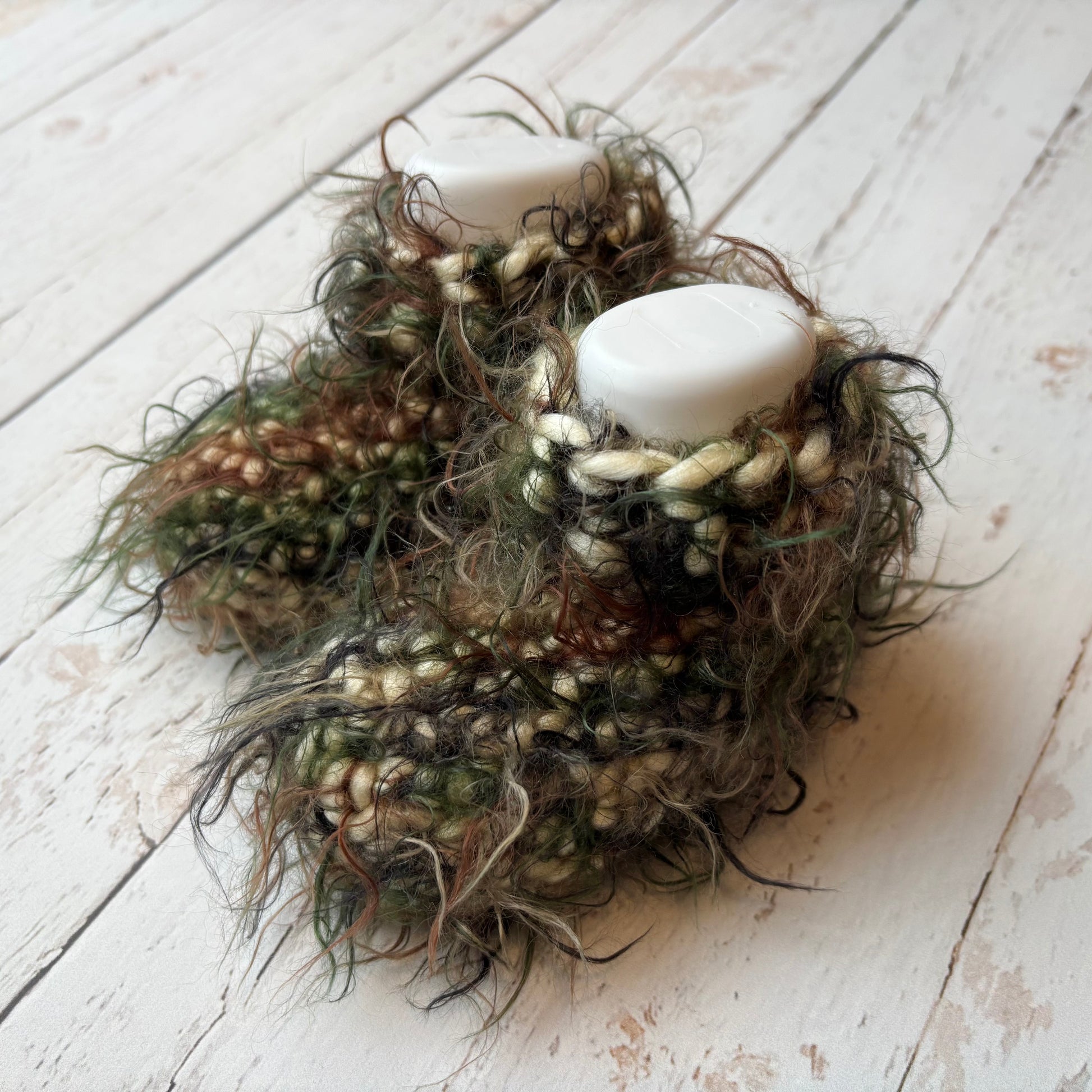 Handmade and ready to ship. Fits approximately 6-12 months of age. Color is camo and yarn is polyester/acrylic.