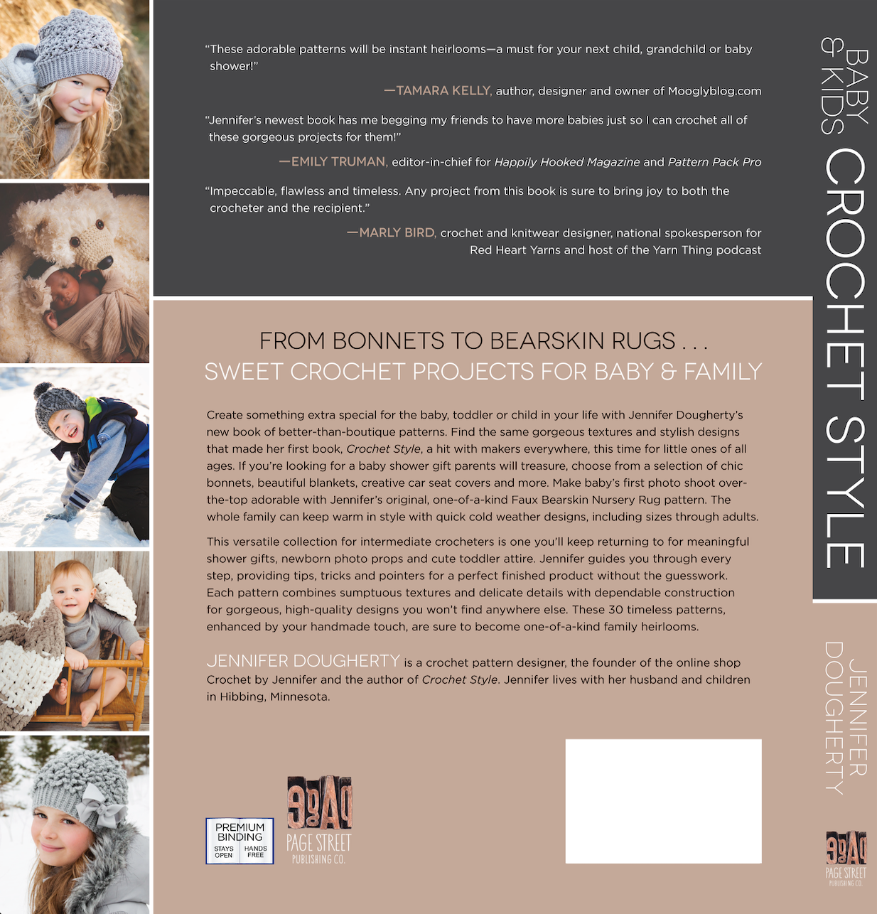 Create something extra special for the baby, toddler or child in your life with Jennifer Dougherty's new book of better-than-boutique patterns. Find the same gorgeous textures and stylish designs that made her first book, Crochet Style, a hit with makers everywhere, this time for little ones of all ages. If you're looking for a baby shower gift parents will treasure, choose from a selection of chic bonnets, beautiful blankets, creative car seat covers and more. Make baby's first photo shoot over-the-top adorable with Jennifer's original, one-of-a-kind Faux Bearskin Rug pattern. The whole family can keep warm in style with quick cold weather designs, including sizes through adults.