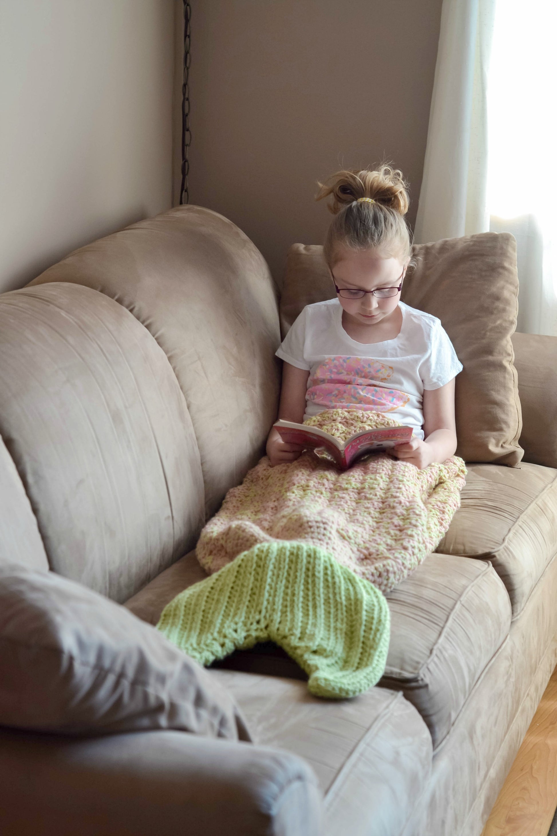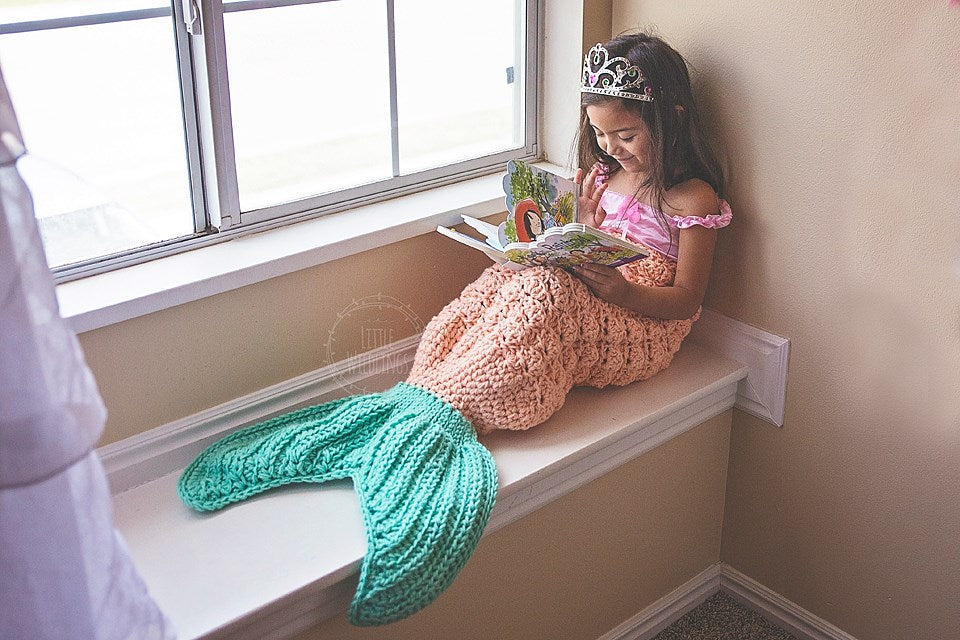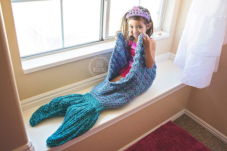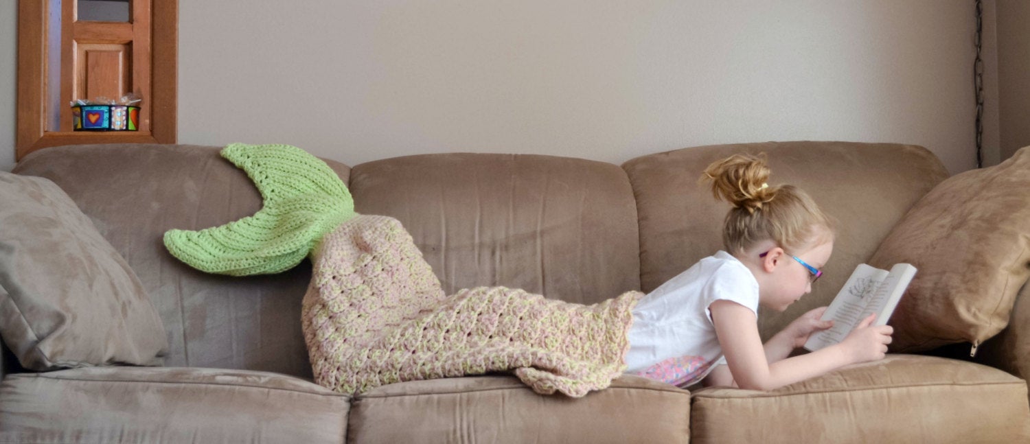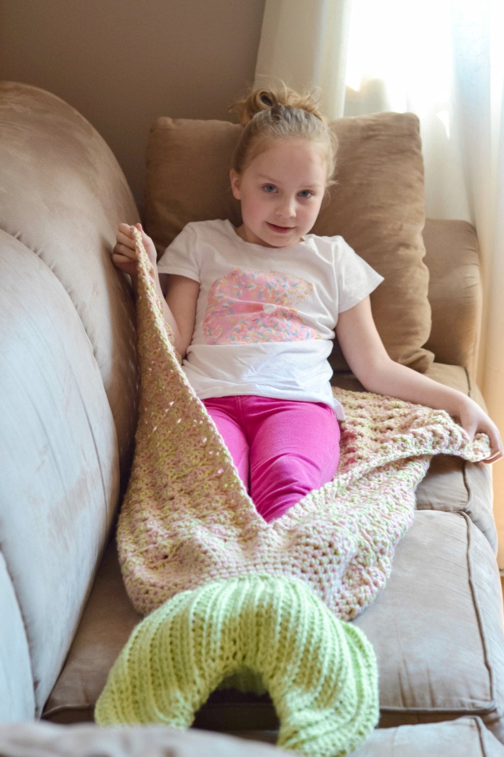 This is a PDF file for a digital pattern to crochet a fun mermaid blanket for cuddling on the couch or even on your bed. What is really special about this pattern is that you can stick your feet in the fin (that part of the blanket is a pocket for the feet) and then it opens up to a blanket on top, which you can wrap around your legs. Make it just long enough to cover your legs if you want a lapghan, or you can make it longer if you want the blanket to reach all the way up to your neck. If you're looking for the photo prop style (or one that includes infant sizes), please see my Mermaid Tail Photography Prop pattern.
