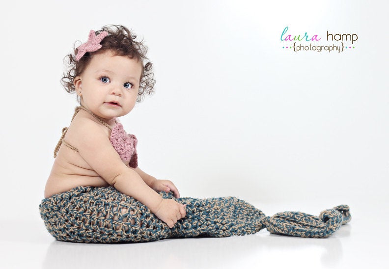 This is a PDF file for a crochet pattern to complete a fun photography prop for a professional photographer or even an amateur that just wants some fun photos. It would also make a great Halloween costume for a baby girl. You are not able to walk in the mermaid tail, so it can only be used for photos, or for a baby that doesn't walk. Some older kids and adults like to use it as a blanket/sleeping bag for lounging on the couch as well.