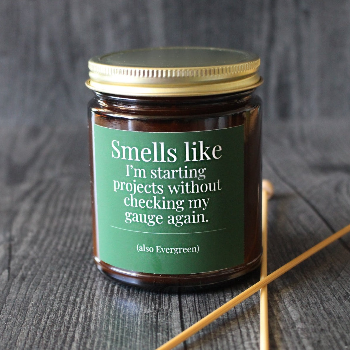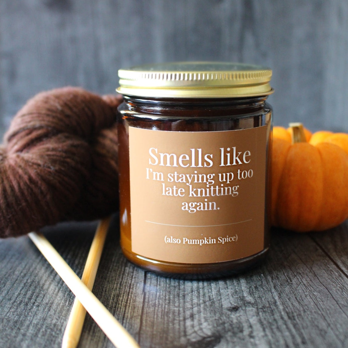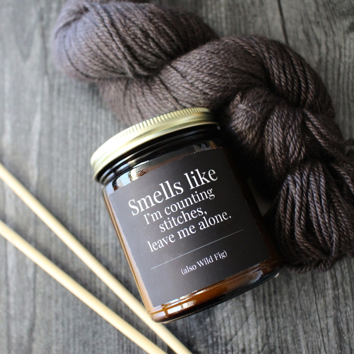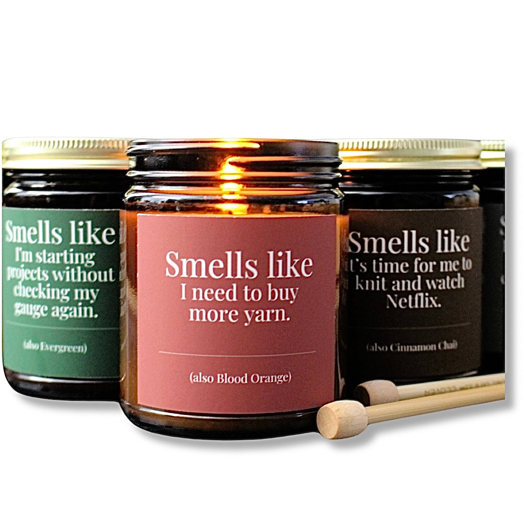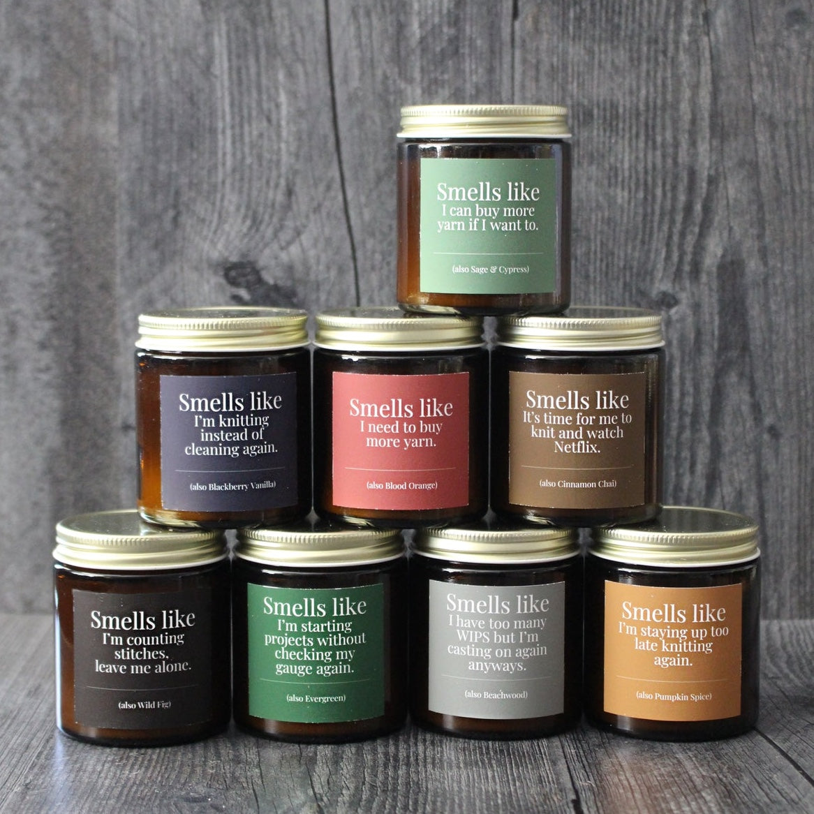 These candles are hand-poured into 4 and 9 oz amber jars which emit a cozy, warm tone when lit and are sure to express what is on every knitter's mind! Perfect for gifts for yourself or your favorite knitter.