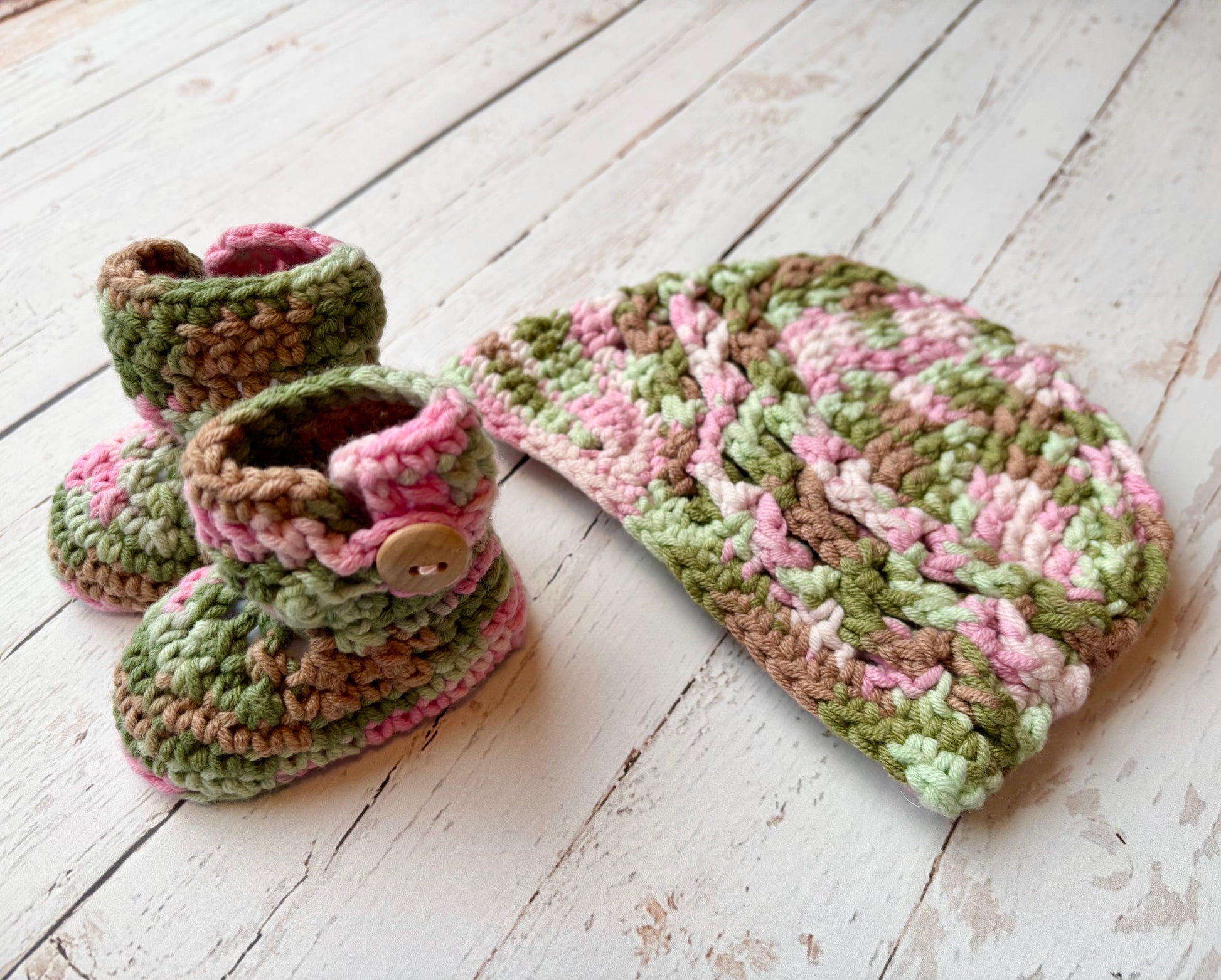 Handmade and ready to ship. Fits approximately 0-3 months of age. Color is pink camo and yarn is 50/50 cotton/acrylic.