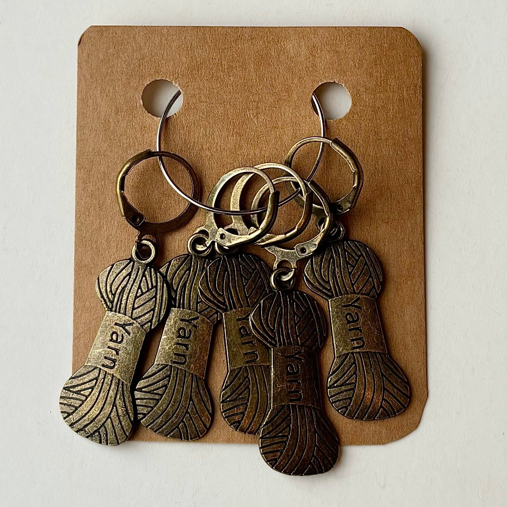These stitch markers hang on a pin that works for both knitting and crochet or with round back lever clasps. Bronze or silver finish. (Sets of 5 or 6 markers)