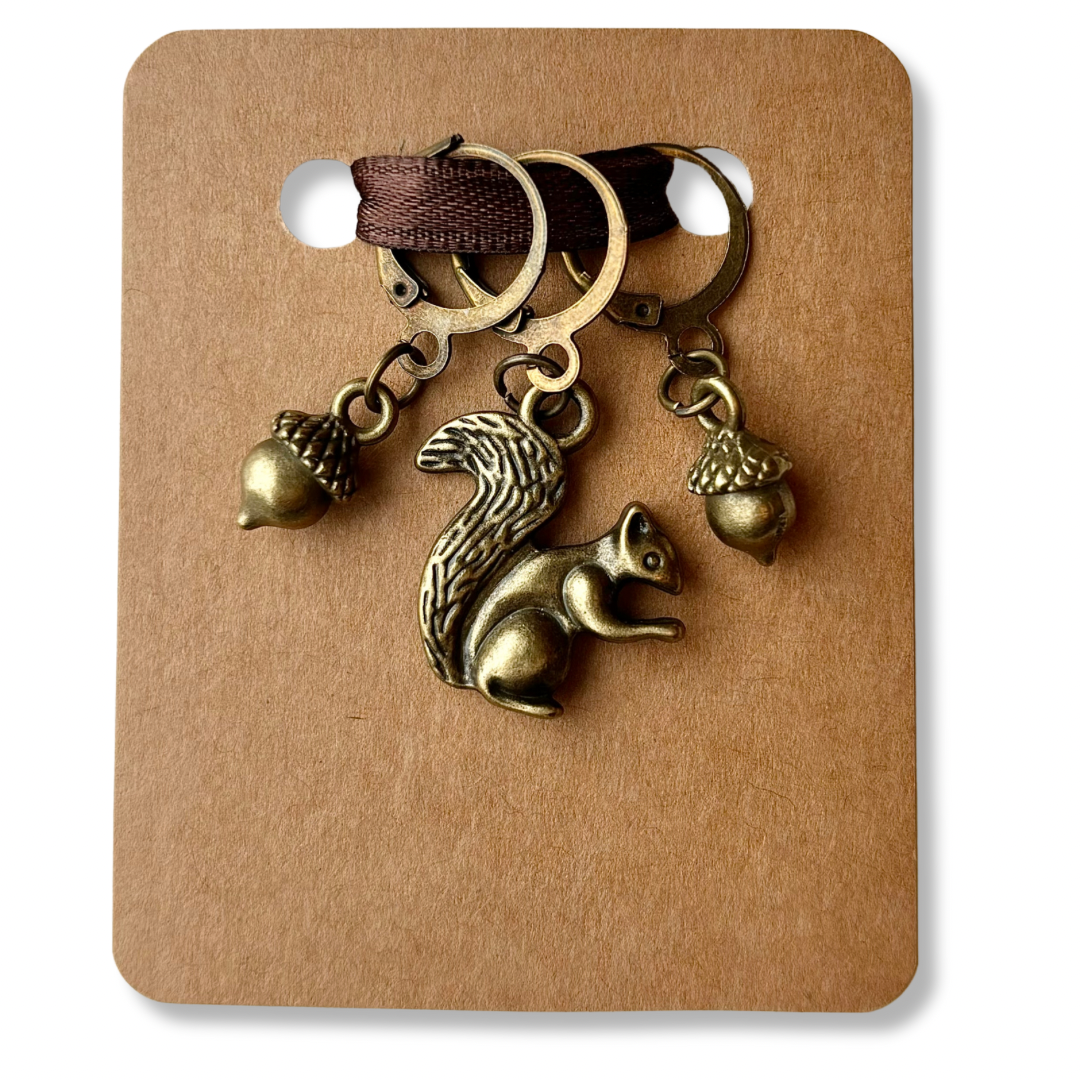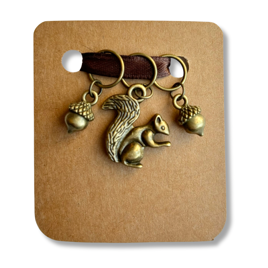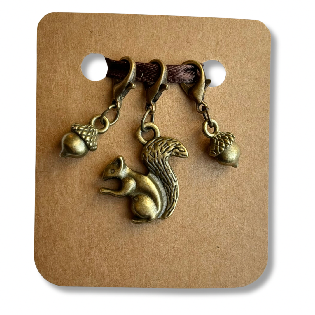 This set of bronze tone stitch markers includes the following: Squirrel and 2 acorns. Set of 3 markers total.