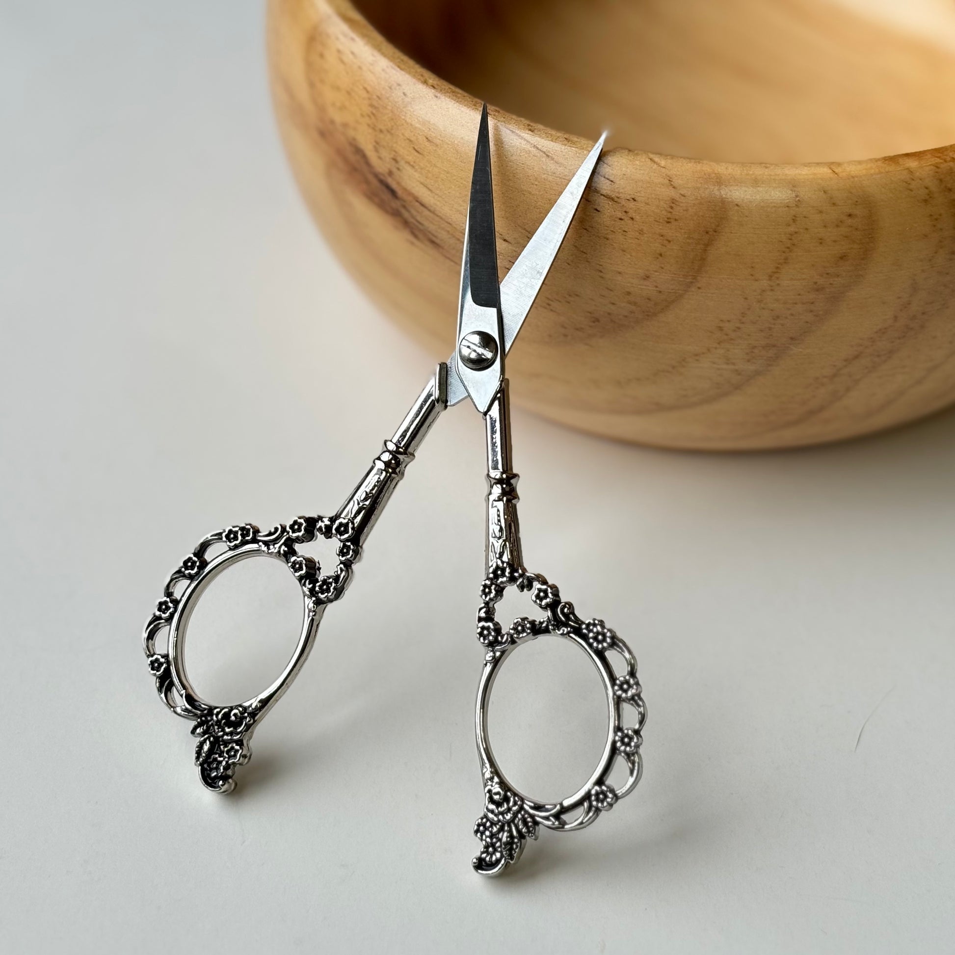 Embroidery scissors with high-quality stainless steel blades and beautiful victorian design handles. Perfect for snipping yarn tails and threads, these little beauties would make a great addition to your knitting bag or sewing basket. They make a beautiful accessory for gorgeous Instagram photos as well.