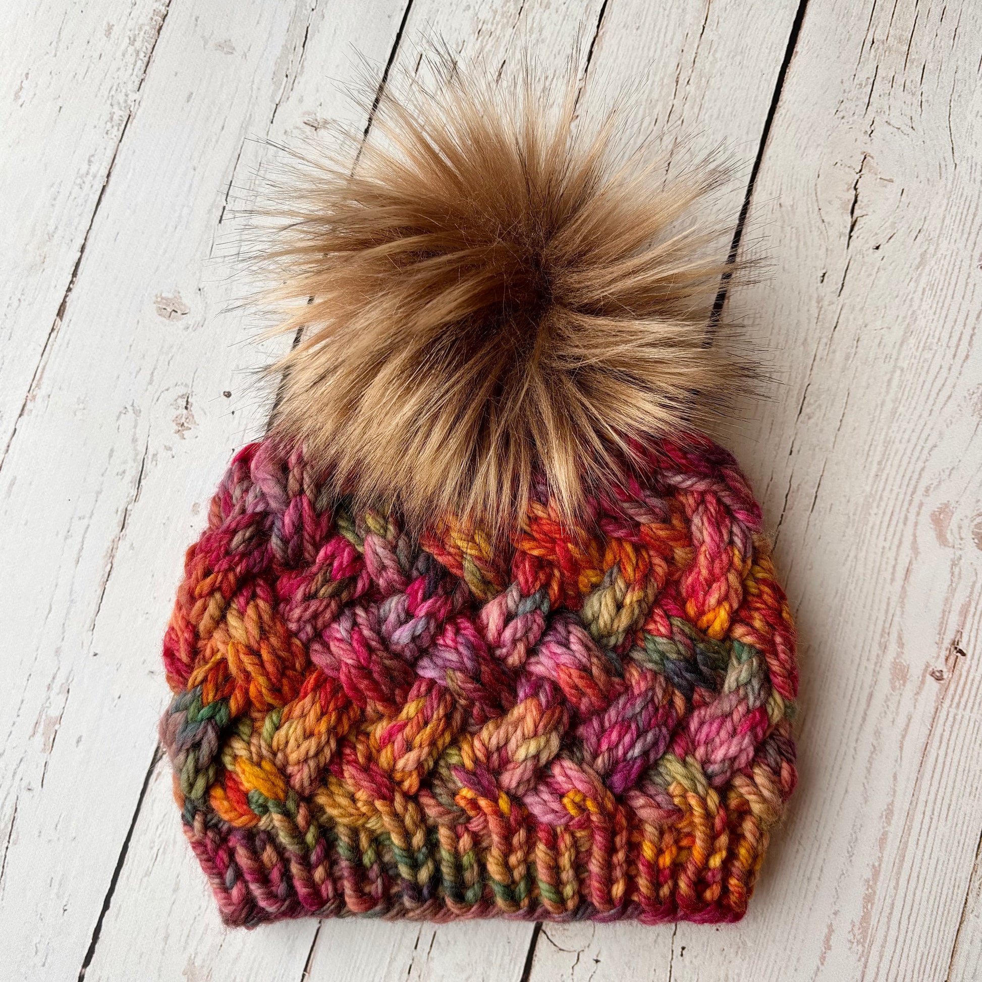 Description: This luxe wool hat is hand knit out of 100% natural fibers that are sustainably and ethically sourced. With one-of-a-kind colors and an unbelievable "squish" factor, Malabrigo is the ultimate in luxury yarn. Designed and hand knit by me. This hat is the ultimate choice for warmth with a double thickness of crossed cable stitches.
